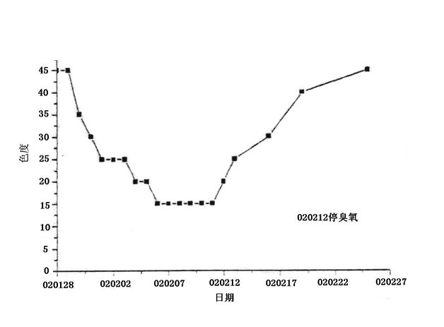 2002/1/28至2002/2/27的實驗顯示了臭氧脫色作用的效果,見圖4。在未通臭氧時,色度達45,在臭氧處理后,色度明顯下降,2002/2/11之后停臭氧,色度很快上升,到2002/2/27,色度升到了最初的水平。