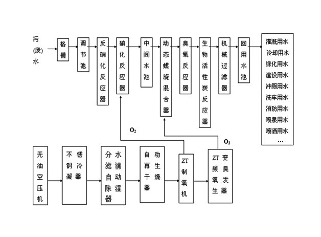 系統(tǒng)采用雙重生化技術(shù)和臭氧——生物活性炭技術(shù)相結(jié)合多級(jí)深化處理工藝流程,確保了回用水的嚴(yán)要求和高標(biāo)準(zhǔn)。